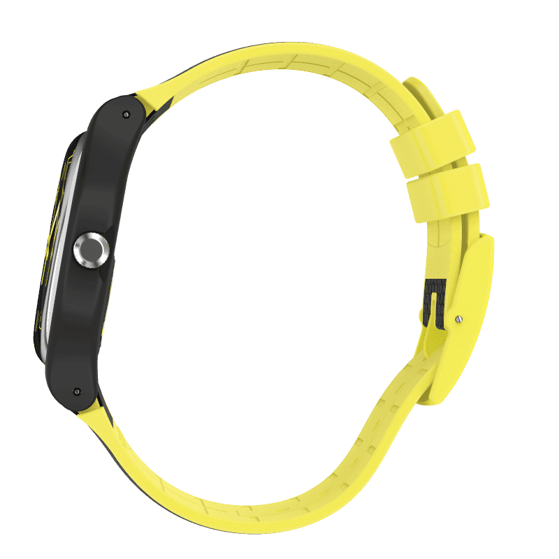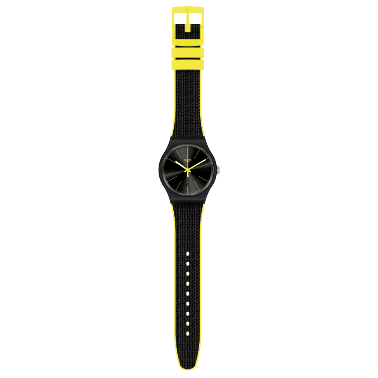 Hang on tight to NIGHT CORD (SUOB406)! The matte yellow strap has an inlay of black fabric and the sun-brushed black dial has yellow hands painted with Swatch Glow.